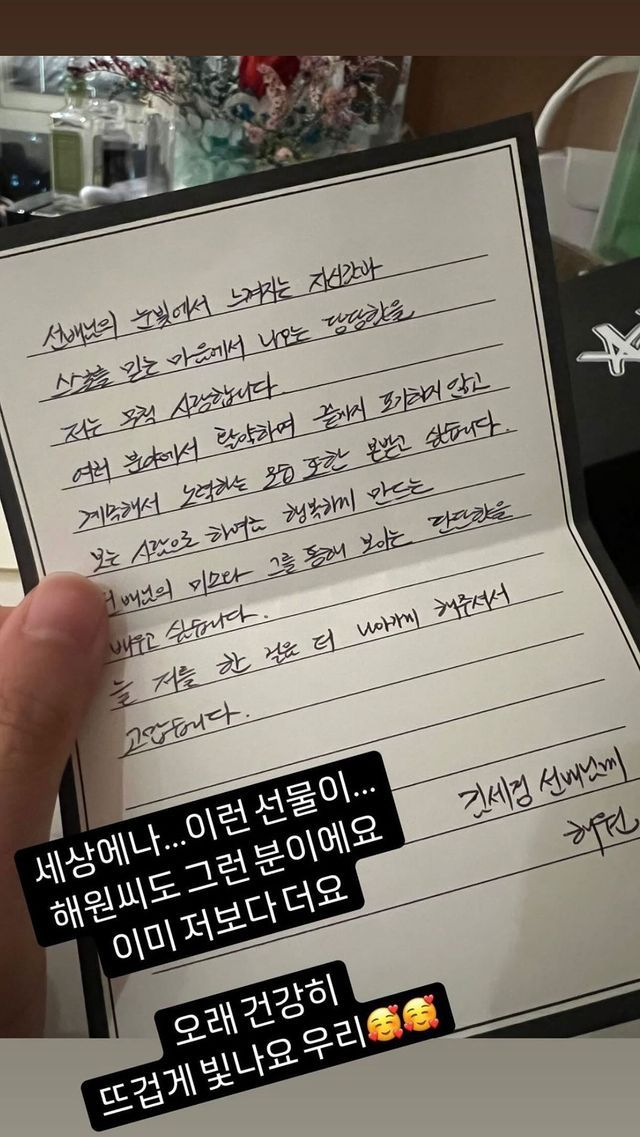 그러면서 "늘 저를 한 걸음 더 나아가게 해주셔서 고맙습니다"라고 덧붙였고, 이에 김세정은 "세상에나...이런 선물이...해원씨도 그런 분이에요. 이미 저보다 더요"라며 "오래 건강히 뜨겁게 빛나요 우리"라고 고마움을 표했다.