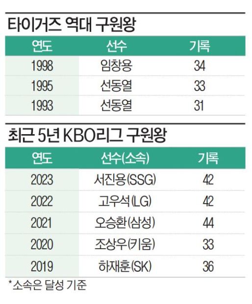 타이거즈는 유독 세이브와 인연이 없었다. 1982년 출범한 프로야구 역사상 '타이거즈 구원왕'은 세 번뿐이었다. 이마저도 1998년 임창용 이후 명맥이 끊겼다. 2015년 윤석민(당시 30세이브·3위) 정도를 제외하면 구원 타이틀에 근접한 선수도 없었다. 풀타임 마무리 투수 4년 차에 접어든 정해영의 도전이 눈길을 끄는 이유다.