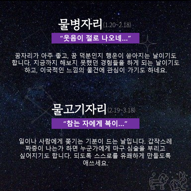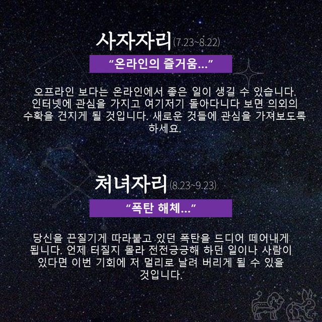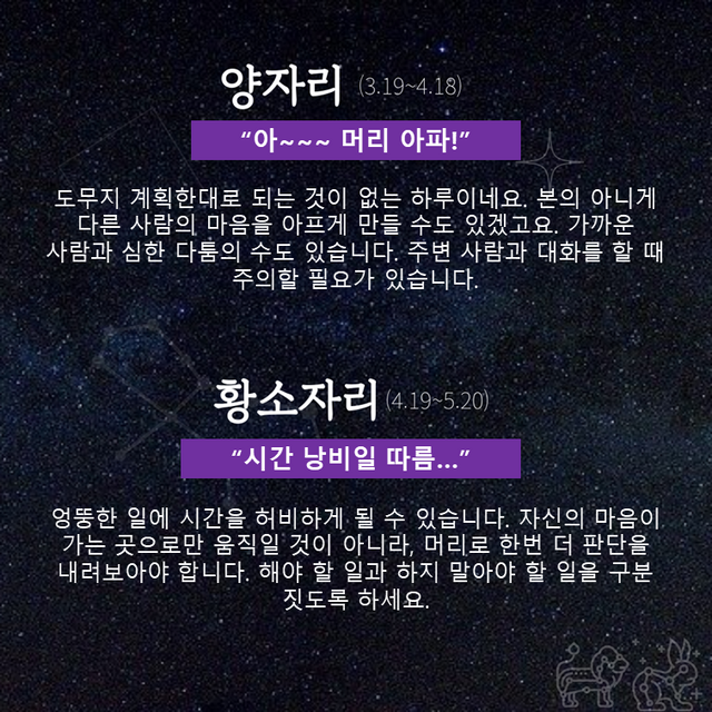 하루 내내 깔깔거릴 수 있는 날입니다. 약간의 실수를 하게도 되지만 주변 사람들이 좋게 봐주니 오히려 기분이 유쾌해지네요. 그리고 이러한 당신의 유쾌함은 주변 사람들에게로 전염되고요.