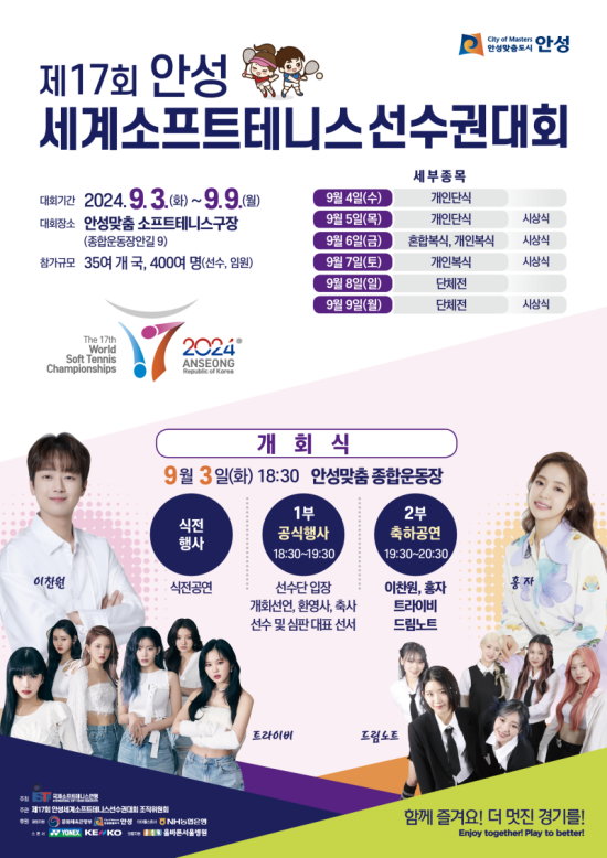 '제17회 안성 세계 소프트테니스 선수권 대회' 개회식은 9월 3일 오후 6시 30분부터 안성맞춤 종합운동장에서 열린다.