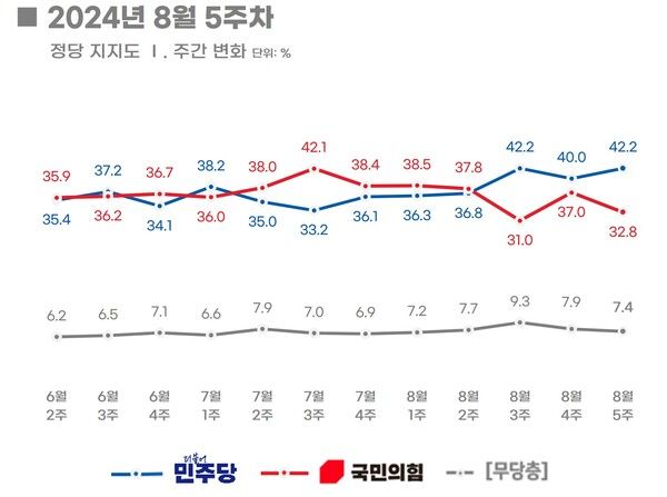정당 지지율은 더불어민주당 42.2%(2.2%P↑), 국민의힘 32.8%(4.2%P↓), 조국혁신당 8.0%(0.3%P↑), 개혁신당 3.9%(0.3%P↑)로 나타났다. 양당 격차는 다시 오차범위 밖으로 벌어진 가운데 TK에서 민주 37.9%·국힘 43.6%로 오차범위 내로 좁혀졌다.