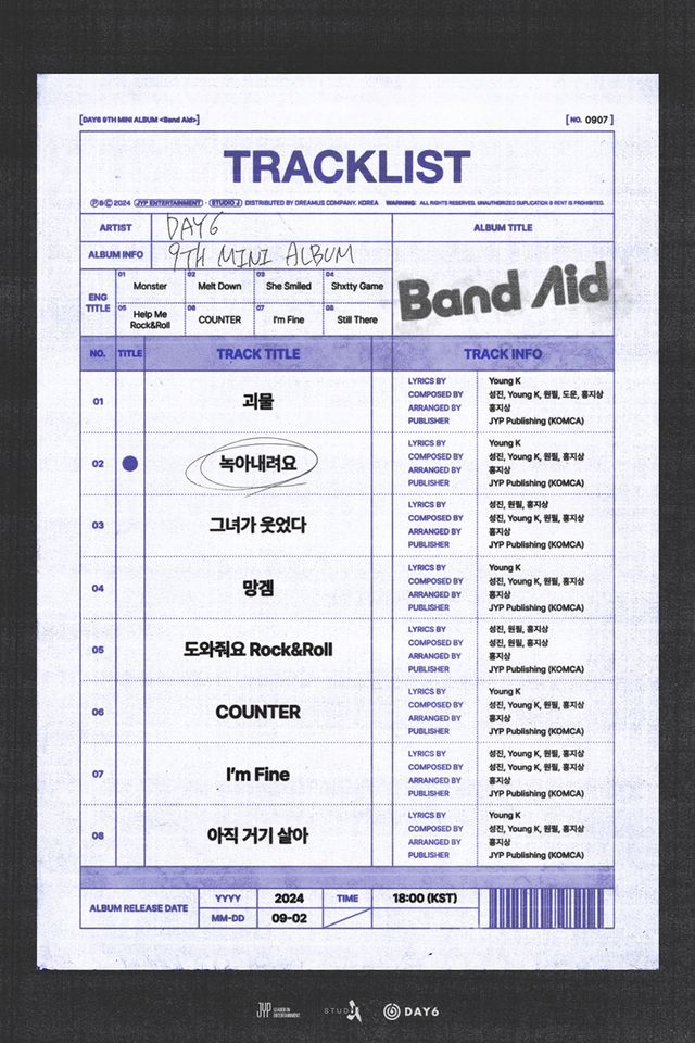 원필: 아홉 번째 미니 앨범 'Band Aid'로 DAY6가 돌아왔습니다! 컴백을 준비하면서 콘서트로 팬분들을 만나고 싶은 마음이 제일 컸던 것 같아요. 이번 앨범을 통해 일상을 살아갈 힘을 조금이라도 받으셨으면 좋겠습니다.