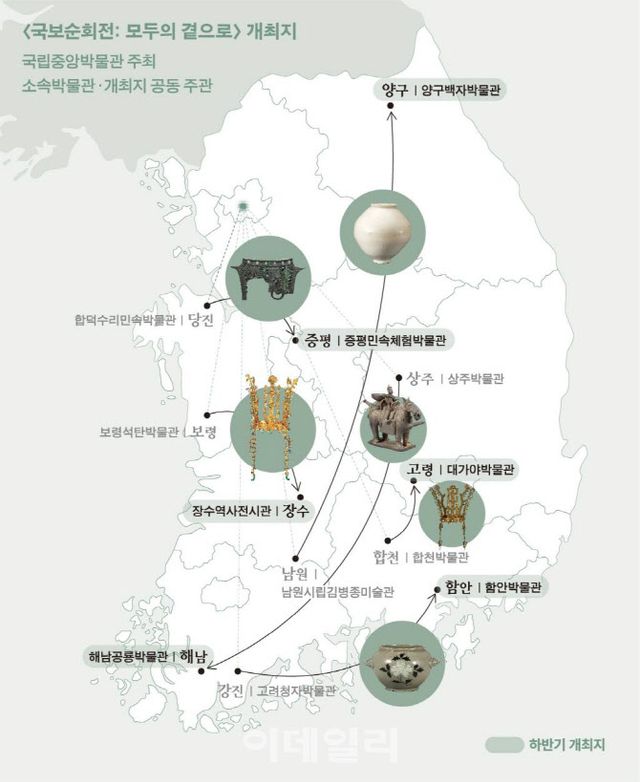‘국보순회전: 모두의 곁으로’는 상반기 전시 이후 잠시 숨을 고른 뒤 9월 6일 충북 증평민속체험박물관을 시작으로 △9월 12일 강원 양구백자박물관 △9월 13일 전북 장수역사전시관 △9월 26일 경북 고령 대가야박물관 △9월 30일 경남 함안박물관 △10월 2일 전남 해남공룡박물관으로 새로운 여정을 이어간다.