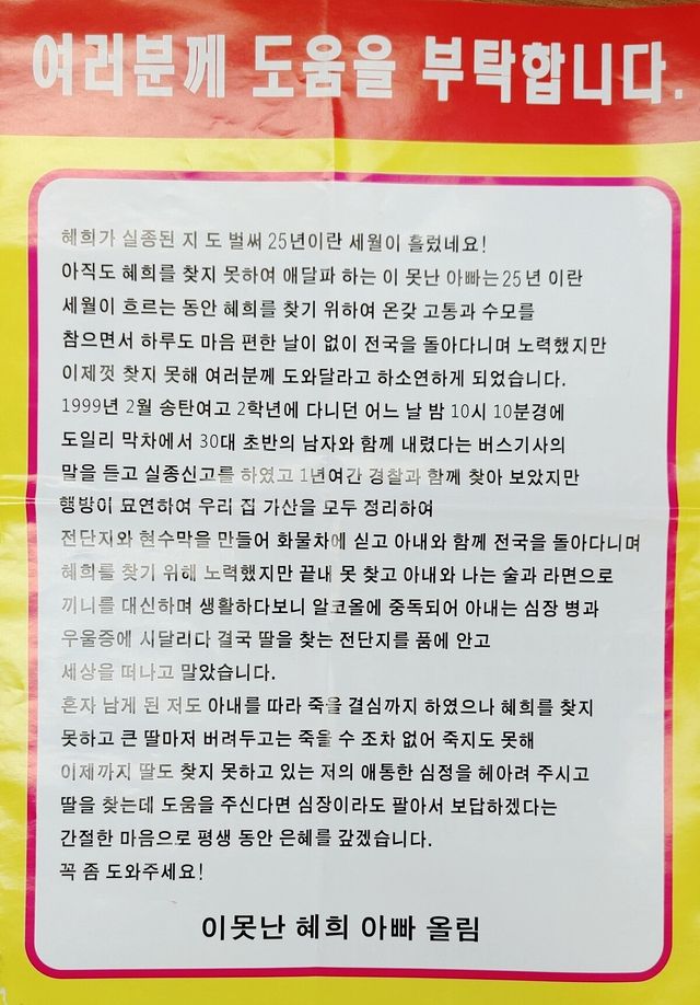 과거 경기도 일대 휴게소에서 송길용 씨에게 물을 건넸던 안산시민 한 모씨(55세)는 “휴게소에서 전단지를 받고 너무 힘들어 보이셔서 생수를 건넸던 기억이 있다”면서 “딸을 가진 부모된 입장에서 꼭 송혜희 씨를 찾아 아버지의 한을 풀어 드렸으면 한다”고 전했다.