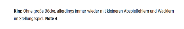 빌트는 "큰 문제는 없었다"면서도 "항상 플레이에서 사소한 실수가 있었고, 포지션 플레이에서 흔들림이 있었다"며 평점 4점을 매겼다. 1점부터 5점까지 매기는 독일식 평점은 숫자가 낮을 수록 좋다. 김민재에게 4점을 줬다는 건 빌트가 김민재의 경기력을 긍정적으로 보지 않았다는 의미다.