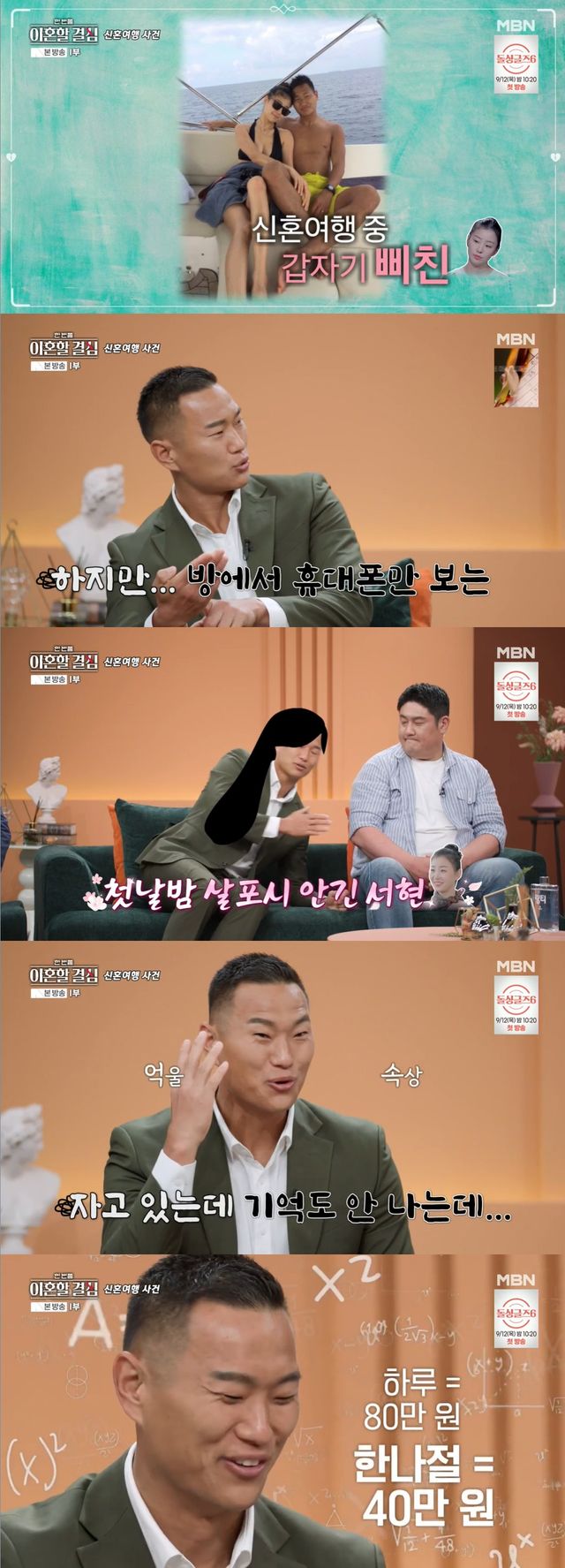 그러면서 "그때 호텔 1박이 80만원이었는데 저희는 하루의 반나절을 날렸으니까 40만원을 손해 본 셈이다"라며 철저히 계산적인 면모를 보여 MC들을 웃프게했다.