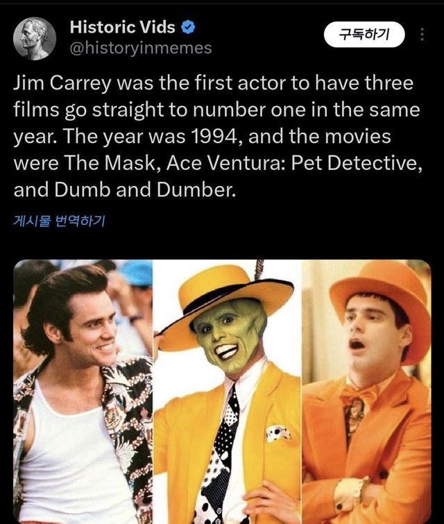 짐 캐리는 같은 해에 세 편의 영화가 연속으로 1위를 차지한 최초의 배우입니다. 그 해는 1994년이었으며 영화는 마스크, 에이스 벤츄라, 덤 앤 더머였습니다.