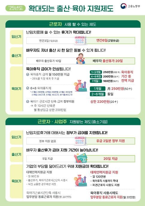 이에 고용노동부는 내년부터 중소기업의 부담을 덜기 위해 육아휴직 사용 시 대체인력지원금을 월 120만원까지 지원하고, 동료가 업무를 분담하는 경우는 월 20만원씩을 지원한다. 또한 근로자의 육아휴직급여도 월 최대 250만원으로 대폭 인상하여 소득 걱정없이 제도를 사용할 수 있도록 할 계획이다.