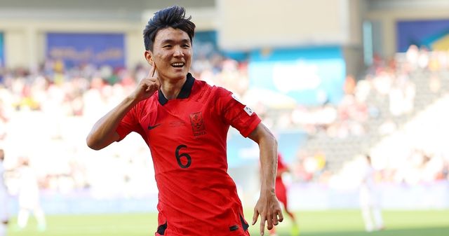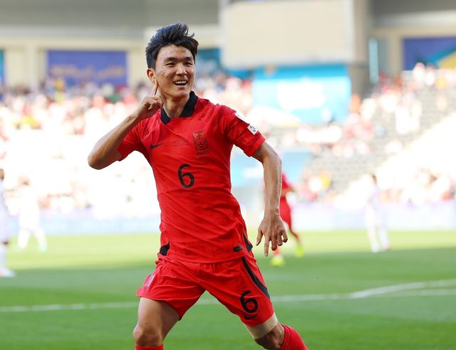 지난 1월 15일(현지 시각) 카타르 도하 자심 빈 하마드 스타디움에서 열린 2023 아시아축구연맹(AFC) 아시안컵 조별리그 E조 한국과 바레인의 경기에서 전반전 황인범이 선제골을 넣은 뒤 기뻐하고 있다. / 연합뉴스