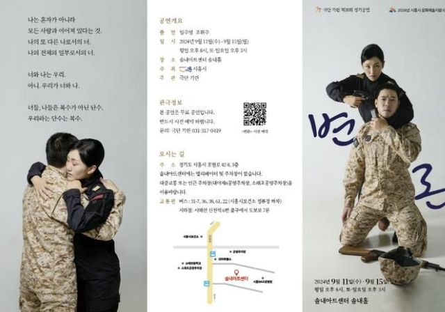 이번 공연은 무료로 진행되며, 9월 11일부터 15일까지 솔내아트센터 솔내홀에서 열린다. 평일에는 오후 8시에, 주말(토, 일)에는 오후 3시에 공연이 시작된다.