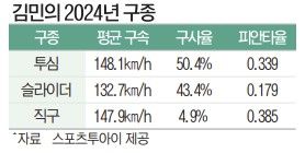 올해 달라진 비결은 투심 패스트볼(투심)이다. 김민은 올 시즌 평균 148.1㎞/h의 투심(구사율 50.4%)으로 타자를 상대한다. 본지와 만난 김민은 "이전까진 150㎞/h 이상 직구를 던지는 투수라는 자부심이 있었다. 그러나 지난해 (래퍼토리를) 바꾸기로 결심했다. 올해도 성공하지 못한다면 (선수로서) 성공할 수 없을 거로 생각했다"라고 돌아봤다.