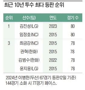 이대로 가면 '역대급' 출전도 가능하다. 현재 페이스로 144경기 정규시즌을 모두 소화하면 이병헌은 약 77경기에 등판하게 된다. 최근 10년 동안 단일 시즌 최다 등판인 80경기(2015년 NC 임정호, 2023년 LG 트윈스 김진성)에 근접한 숫자다. 입단 직전 왼 팔꿈치 수술을 받았던 어린 투수에겐 작지 않은 부담이다.