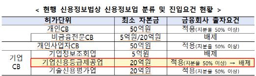 이번 개정안에 따르면, 기업신용등급제공업의 금융회사 출자 의무가 폐지된다. 기업신용정보는 개인정보가 아니라 개인정보보호 문제가 없다는 점, 다양한 기업 데이터를 보유한 사업자의 신규 진입을 활성화할 필요가 있다는 점 등을 감안한 것이다.
