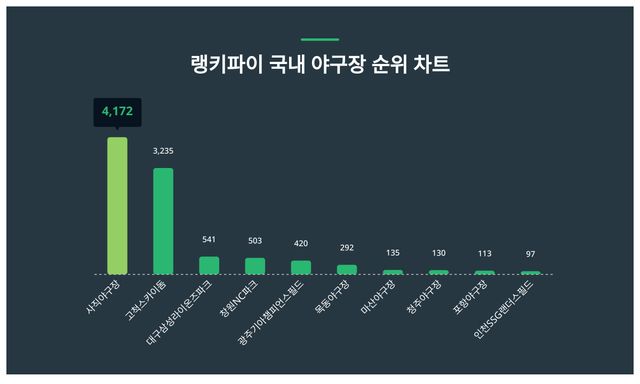 이번 국내 야구장 1위 사직야구장는 4,172포인트로 전주 대비 2,458포인트 상승했다.