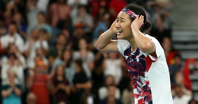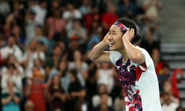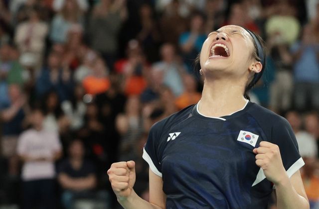 지난달 4일(현지 시각) 프랑스 파리 포르트드 라 샤펠 아레나에서 열린 2024 파리올림픽 배드민턴 여자 단식 4강전에서 한국 안세영이 인도네시아 그레고리아 마리스카 툰중을 상대로 승리, 결승에 진출한 뒤 환호하고 있다. / 연합뉴스