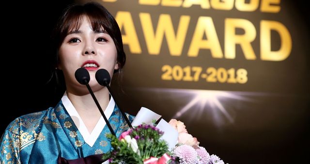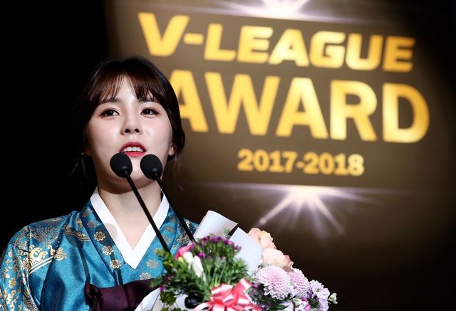 이다영 선수가 2018년 4월 3일 오후 서울 그랜드힐튼호텔에서 열린 도드람V리그시상식에서 베스트7 상을 받은 뒤 인사말을 하고 있다. / 연합뉴스