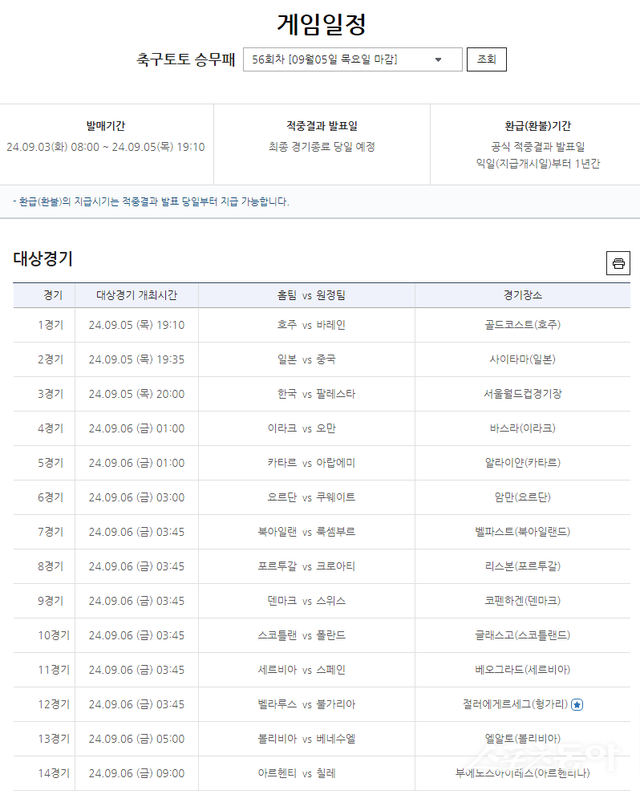 이번 축구토토 승무패 56회차에는 대한민국-팔레스타인을 비롯해 일본-중국(2경기), 포르투갈-크로아티아(8경기), 덴마크-스위스(9경기), 세르비아-스페인(11경기), 아르헨티나-칠레(14경기) 등 축구팬들의 이목이 집중될 만한 경기가 다수 포함됐다.