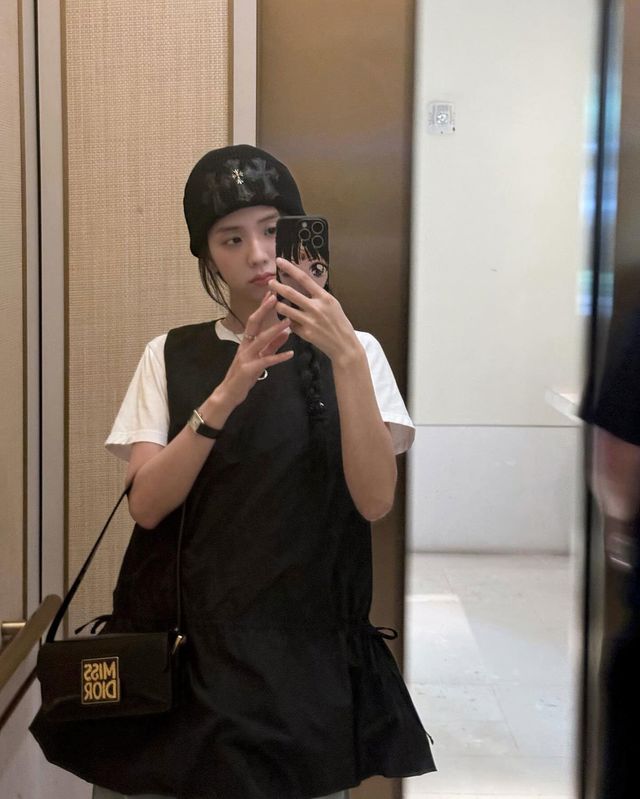 또 다른 사진에서 지수는 러블리한 매력을 드러내며 수수하면서도 힙한 패션으로 색다른 모습을 선보였다.