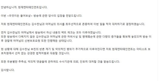 4일 김수찬 소속사 현재엔터테인먼트는 공식 팬카페를 통해 "김수찬님과 어머니의 의사를 최우선적으로 존중해 이번 일을 적극 대처하기로 결정했다"고 밝혔다.