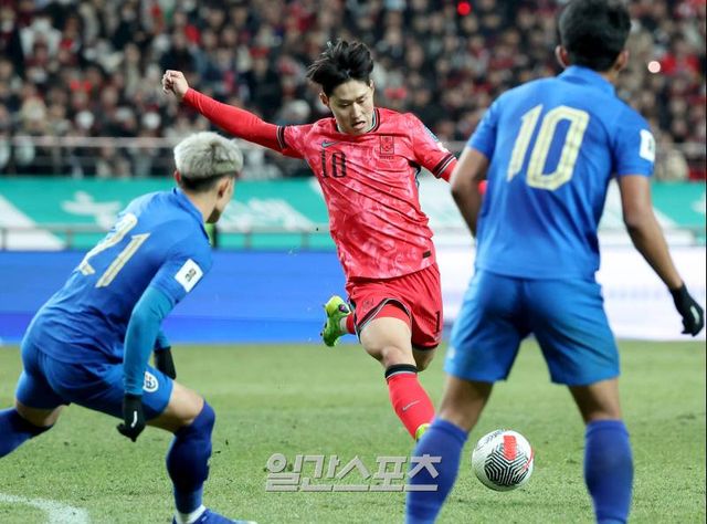 이강인은 지난 6월 김도훈 임시 감독 체제에서 열린 싱가포르(2골), 중국(1골·결승골)과의 월드컵 2차 예선 2연전 모두 득점했다. 올해 열린 A매치 11경기에선 6골 2도움을 기록 중이다. 같은 기간 손흥민(7골)에 이어 대표팀 선수들 가운데 두 번째로 득점이 많다. 이강인이 단숨에 대표팀 공격의 중심에 자리 잡은 배경이다.