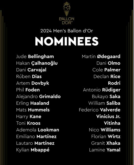 유럽에서 한 시즌 동안 가장 많은 골을 터트린 선수에게 주어지는 유러피언 골든 슈를 수상한 해리 케인(바이에른 뮌헨)도 후보에 선정됐고, 스페인 축구대표팀 일원이자 유로 2024 최고의 스타 중 한 명인 2007년생 신성 라민 야말(바르셀로나)은 17세 나이에 발롱도르 후보에 이름을 올리는 기염을 토해냈다.