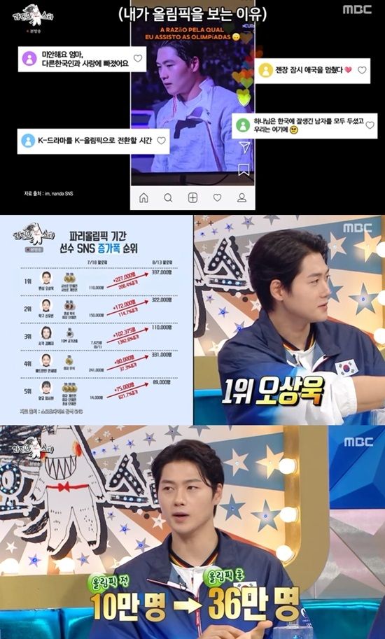 오상욱은 열애설 이후 MBC '라디오스타'에 출연해 "파리올림픽 선수 중에 개인 계정 팔로워 증가 순위가 있는데 일등을 했다. 올림픽 전에는 10만 명이었는데, 올림픽이 끝나고 36만 명이 됐다. 파리올림픽 선수 중에 제가 SNS 증가폭 순위 1위다. 김예지 선수가 3위, 임서현 선수가 5위를 했더라"고 이야기했다. 또한 "브라질 팬이 '내가 올림픽을 보는 이유'라는 영상을 올려주셨는데, 그게 600만 뷰가 나왔다"고 밝혀 놀라움을 자아냈다.