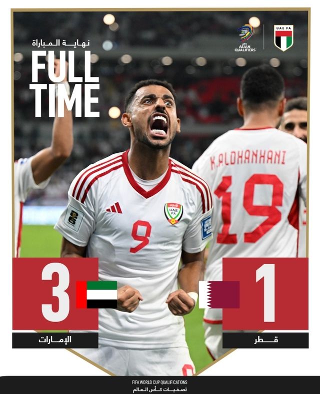 벤투 감독이 이끄는 UAE 축구 국가대표팀은 6일(한국시간) 카타르 도하에 위치한 아흐마드 빈 알리 스타디움에서 열린 카타르와의 2026 FIFA 북중미 월드컵 아시아 3차 예선 A조 1차전에서 전반 38분 선제골을 허용했으나 후반전에만 내리 세 골을 몰아치며 3-1 역전승을 거뒀다.