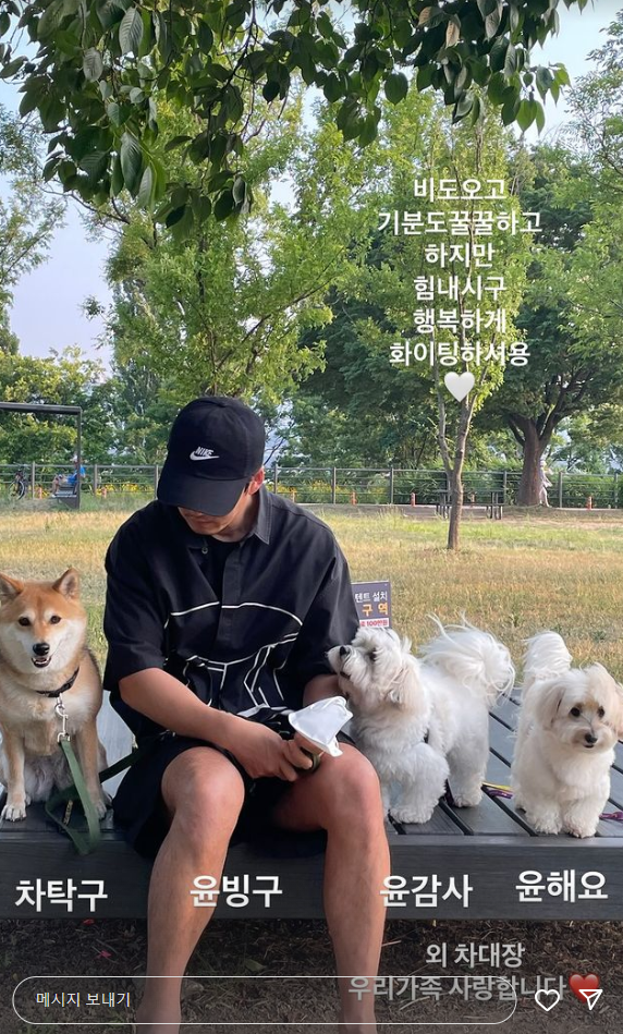 사진 속 윤계상은 아내 차혜영 대표와 함께 가족이 된 반려견 세 마리 사이에서 살짝 미소를 짓고 있다. 반려견의 이름과 자신을 나란히 둔 그는 "차대장, 우리가족 사랑합니다"라는 글로 남다른 애정을 과시했다.