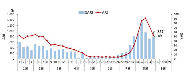 지난 7월부터 8월 중순까지 증가했던 코로나19 표본감시 입원환자 수는 지난 35주(8월25~31일) 837명으로 정점(33주, 1464명) 대비 42.8% 감소해 2주 연속 상당폭의 감소세를 보였다. 중증급성호흡기감염증 표본감시에서는 코로나19 입원환자 수가 32주차(8월4~10일, 83명)에 정점 기록 후 2주 연속 감소했다가 35주에는 49명으로 전주 대비 소폭 증가(6.5%)했다.
