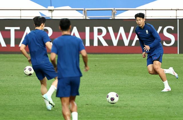 북중미 월드컵 아시아 3차 예선 1차전 한국-팔레스타인과의 경기를 하루 앞둔 지난 4일 오후 서울월드컵경기장에서 진행된 대한민국 축구 대표팀 공식 훈련에서 손흥민이 패스 훈련을 하고 있다. / 연합뉴스