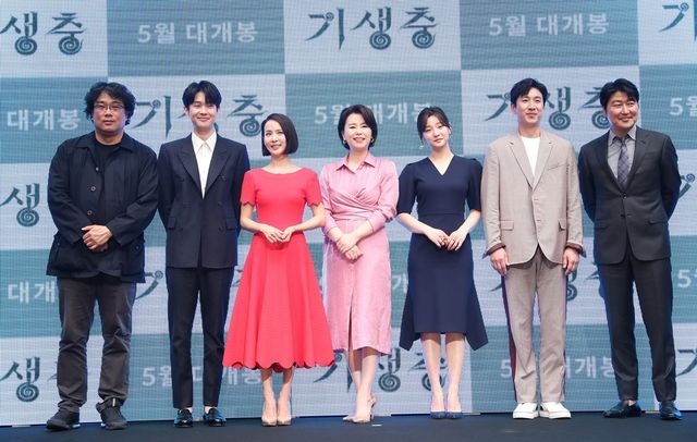 봉준호 감독(왼쪽부터), 배우 최우식, 조여정, 장혜진, 박소담, 이선균, 송강호가 2019년 4월 22일 서울 중구 소공동 웨스틴 조선호텔에서 열린 영화 ‘기생충’ 제작보고회에서 포즈를 취하고 있다. / 뉴스1