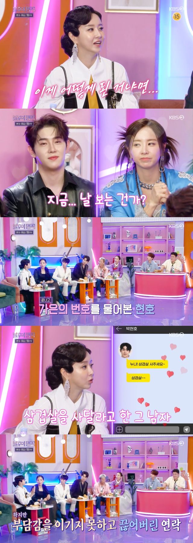 은가은은 "녹화하는데 자꾸 쳐다보더라. 어쩌다가 아이콘택트를 하게 됐는데 녹화 끝나고 번호를 물어봤다. 그 후로 연락 와서 계속 삼겹살 사달라고 하길래 부담감을 이기지 못하고 연락을 끊었다"며 첫 대화를 회상했다.