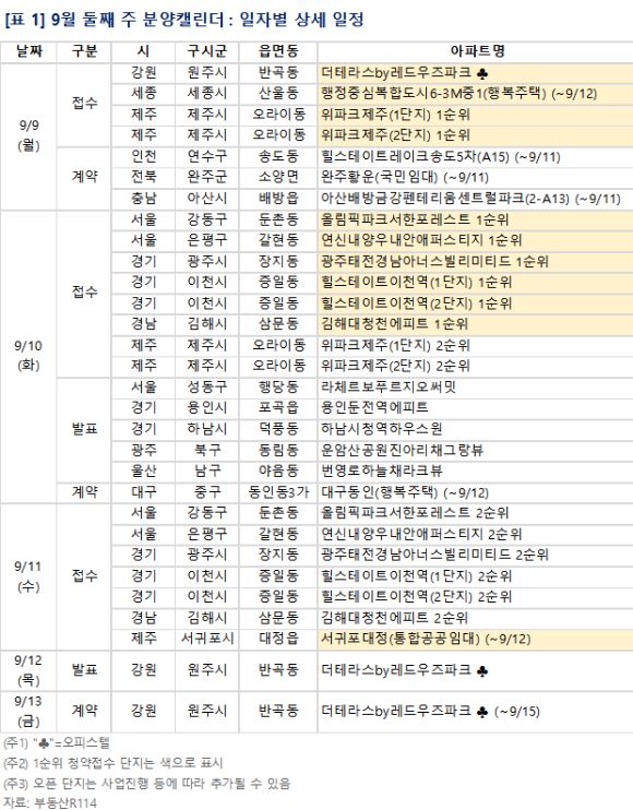 [아이뉴스24 이수현 기자] 9월 둘째 주에는 전국 11개 단지 총 5353가구(일반분양 3097가구)가 분양을 시작한다. 추석 연휴를 앞두고 문을 여는 견본주택은 없다.