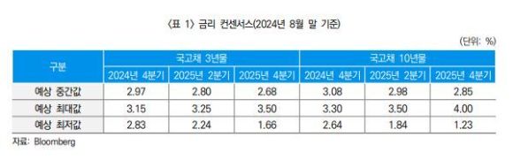 문제는 시장 금리가 계속 내리고 있다는 점이다. 국고채 10년물은 지난해 10월 4.335%에서 지난 8월 말 3.088%로 1.23%p 하락했다. 국내외 애널리스트들은 국고채 10년물 금리를 올해 4분기 3.08%, 오는 2025년 4분기 2.85%로 하락할 것으로 전망했다.