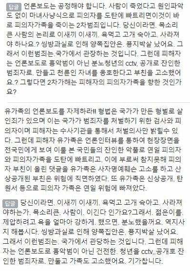 그는 "범행동기가 공익이라면 (피의자에게) 보상을 해야한다" "피해자가 먼저 쌍욕을 했다" "(내 아들이) 대의를 위해 희생했다" "쌍방과실이다" "재심이 필요하다" "피의자도 할 말 있다" "유족은 자제하라" 등 취지로 50개 이상의 댓글을 작성했다.