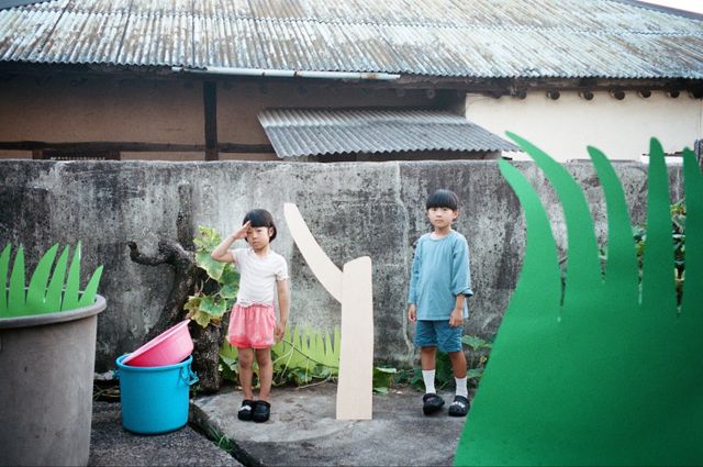 평면의 색종이를 이용하여 함께 촬영하였고, 색이 잘 보이는 굵은 텍스트들은 실재하는 공간, 인물과 어우러지면서 페인팅적인 역할을 하였습니다. 색종이의 아날로그적인 작업들과, 이야기의 배경이 되는 한국 시골집의 모습이 디카보다는 필름 카메라에 훨씬 잘 담겼습니다.