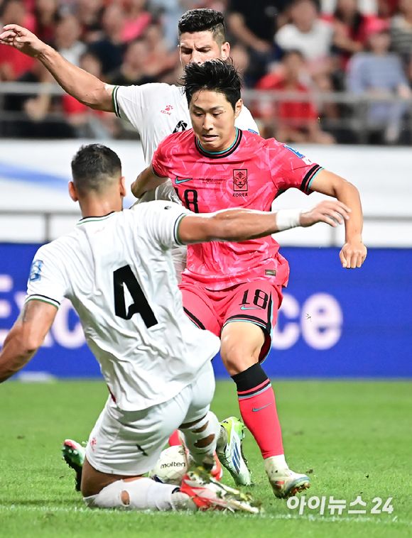 이강인이 지난 5일 서울월드컵경기장에서 열린 대한민국과 팔레스타인과 2026 FIFA 북중미 월드컵 아시아 지역 3차 예선 1차전에서 드리블을 하고 있다. [사진=곽영래 기자]