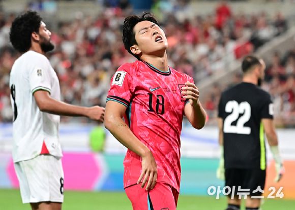 이강인이 지난 5일 서울월드컵경기장에서 열린 대한민국과 팔레스타인과 2026 FIFA 북중미 월드컵 아시아 지역 3차 예선 1차전에서 골 찬스를 놓친 뒤 아쉬워하고 있다. [사진=곽영래 기자]