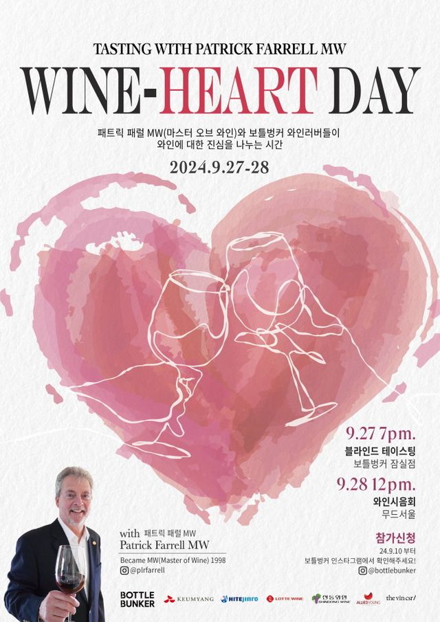 이에 보틀벙커는 본격적인 와인의 계절을 맞아 와인을 진심으로 즐기는 와인러버들을 위해 '패트릭 MW'와 함께하는 테이스팅 행사 및 시음회 '와인하트 데이(Wine-Heart Day)'를 진행한다. 행사는 27일과 28일 양일 간 진행되며, 9월10일부터 보틀벙커 공식 SNS 계정에서 선착순으로 참가 신청이 가능하다.