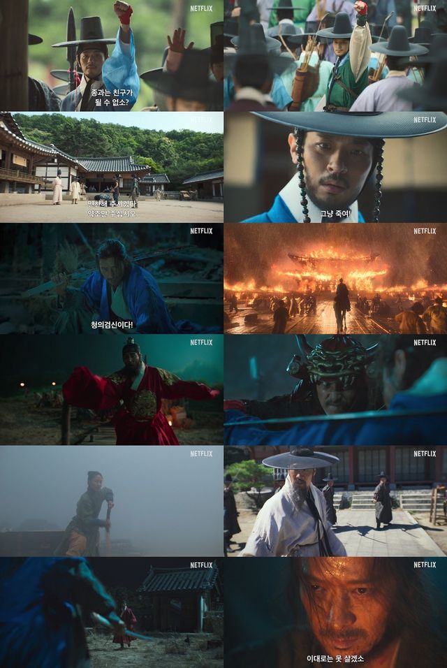 함께 공개된 예고편은 조선 최고 무신 집안의 외아들과 그의 몸종이라는 신분의 차이에도 불구하고, 어린 시절부터 격의 없이 지내며 우정을 나누는 천영과 종려의 모습으로 시작된다. “종과는 친구가 될 수 없소?” 라는 종려의 대사와 함께 무술 대련을 하고, 붉은 천을 서로의 손에 묶어주며 우정의 증표를 나누는 모습은 두 사람의 막역한 사이를 보여준다. 천영은 노비 신분에서 벗어나 본래의 양인 신분으로 되돌아가고자 종려의 집안에 헌신을 다하지만, 면천을 약조했던 이들이 등을 돌리면서 천영과 종려의 관계도 어긋나기 시작한다. 한편, 임진왜란이 발발하고 전쟁을 피할 수 없게 되자 세태는 더욱 혼란 속으로 빠져든다. 의병이 된 천영과 선조의 최측근 무관이 된 종려는 더이상 친구가 아닌 적이 되어 서로를 마주하고, “주인을 무는 개는 죽일 수밖에” 라는 종려의 대사는 걷잡을 수 없이 뒤틀린 두 사람의 관계를 암시한다. 뛰어난 검술로 왜적들을 두려움에 떨게 만드는 ‘청의 검신’으로 불리게 된 천영과 그를 향한 분노로 질주하는 종려의 대립은 숨막히는 긴장감을 불어넣으며, 두 사람이 보여줄 스타일리시한 액션에 대한 기대를 증폭시킨다. 뿐만 아니라, 농기구를 휘두르며 거친 카리스마를 뿜어내는 의병 범동 역의 김신록과 남다른 기개로 민중을 이끄는 의병장 김자령 역의 진선규, 일본군의 잔혹한 선봉장 겐신 역의 정성일, 그리고 백성을 버리고 도망친 난세의 군주 선조 역의 차승원까지. 각자의 캐릭터로 완벽하게 변신한 믿고 보는 배우들의 뜨거운 연기 앙상블은 몰입도를 높일 것으로 기대를 모은다. 마지막으로, 모두가 각자의 자리에서 주어진 운명에 맞선 전쟁을 벌이는 가운데, “이대로는 못 살겠소”라는 천영의 묵직한 한 마디는 모든 것이 무너진 혼란의 시대를 지나는 이들이 과연 어떤 이야기를 펼쳐보일지 궁금증을 고조시킨다.