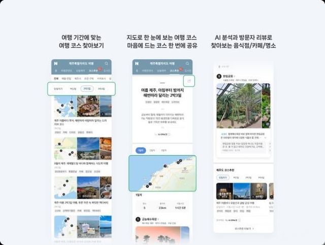 네이버의 '에어스페이스'는 다양한 데이터를 분석해 최적의 여행 코스를 제안한다. 예를 들어, 제주도 여행을 검색하면 에어스페이스는 유명한 관광지뿐만 아니라 잘 알려지지 않은 숨은 명소도 추천해 준다. 이동 거리와 소요 시간까지 고려해 여행 일정을 효율적으로 계획할 수 있다.