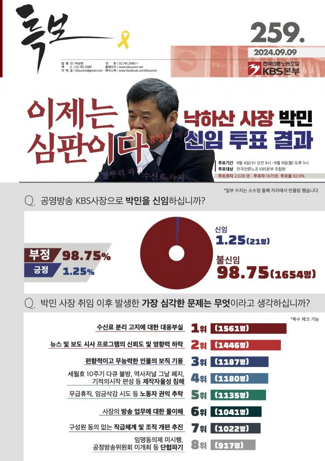 전국언론노동조합 KBS본부 쟁의대책위원회가 지난 4일부터 9일까지 엿새 동안 박 사장에 대한 신임 투표를 진행해 9일 발표한 결과에 따르면, '공영방송 KBS사장으로 박민을 신임하느냐'는 질문에 응답 98.75%(1654명)가 '불신임'한다고 답했다. 이번 조사에는 전체 2028명의 투표 대상 가운데 82%인 1675명이 참가했다.