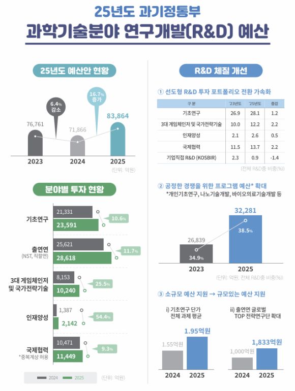 문제는 이날 내놓은 이창윤 차관의 설명은 물론 과기정통부 자료가 입맛에 따라 취사선택했다는 데 있다. 과학기술분야 R&D 현황을 보면 2023년 7조6761억원에서 올해 7조1866억원으로 줄었다. 내년에는 8조3864억원으로 증가했다. 금액인 만큼 객관적 수치였다.