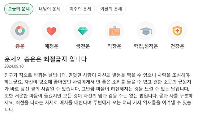 네이버 운세는 "친구가 적으로 바뀌는 날이다. 믿었던 사람이 자신의 발등을 찍을 수 있으니 사람을 조심해야 한다"라고 밝혔다.