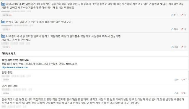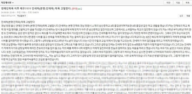 이에 A씨는 "안세하는 저를 복도에서 마주칠 때마다 괴롭혔다"라며 "졸업을 할 때까지 강제로 싸움을 하거나 동급생들의 웃음거리가 되어야 했다"라고 억울함을 호소하며 마무리했다.
