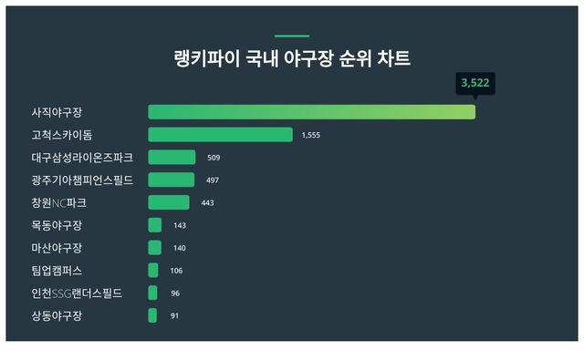 이번 국내 야구장 1위 사직야구장는 3,522포인트로 전주 대비 650포인트 하락했다.