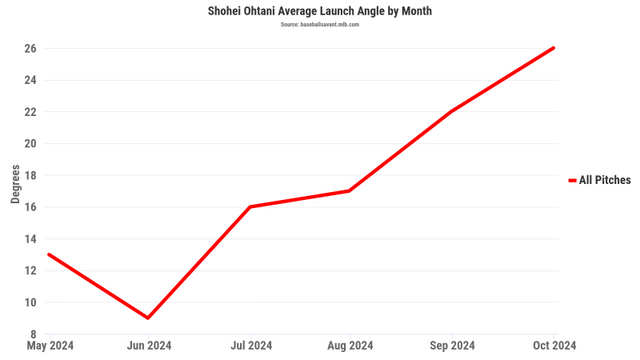 헛스윙이 늘지 않았는데 생산성이 떨어진 원인은 발사각에 있다. 이현우 위원은 "타율이 떨어진 가장 큰 원인은 타구 각도다. 공을 너무 띄우려 한다고 볼 수 있다. 7월 이전 14도였던 오타니의 평균 타구 각도가 8월 이후엔 22.9도까지 높아졌다"라고 비교했다.