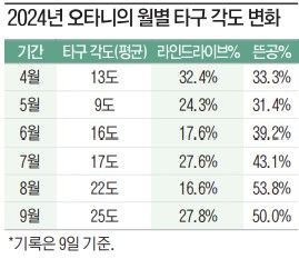 주목할 건 달성 과정이다. 오타니는 40홈런 40도루 달성을 앞둔 시점부터 타격 스타일이 달라졌다. 꾸준히 3할 타율을 유지했던 지난달 8월 12홈런 15도루를 기록하는 동안 월간 타율이 0.238까지 떨어졌다. 오타니는 "기록을 의식하지 않는다"고 했지만, 50홈런 50도루 달성을 의식한 게 아니냐는 평가가 나오는 이유다.