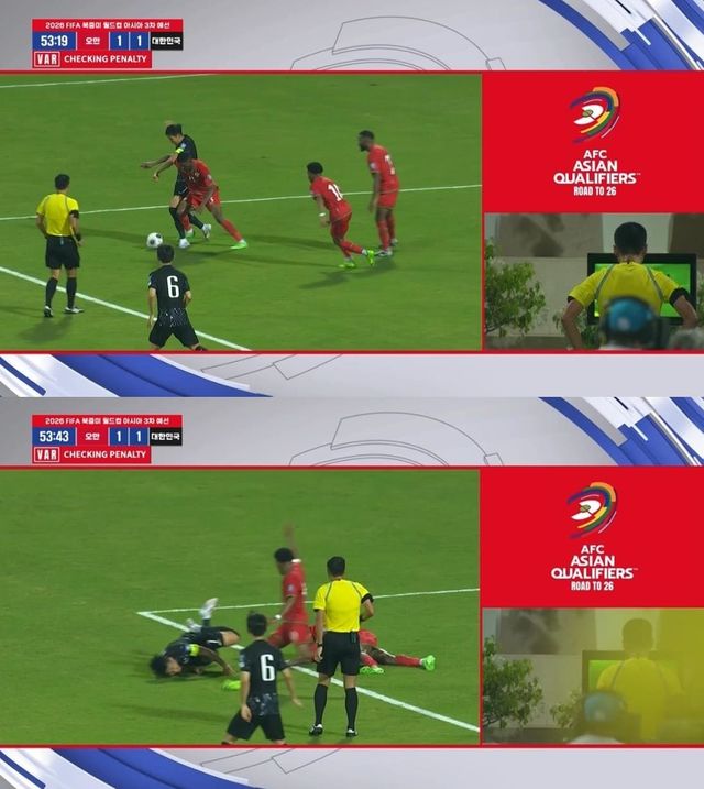 오만전 후반 6분 페널티킥 선언 이후 온필드 리뷰 확인하는 마닝 주심 / 쿠팡플레이