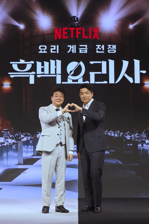 백종원, 안성재가 11일 서울 종로구 JW메리어트동대문스퀘어서울에서 열린 넷플릭스 새 예능 '흑백요리사' 제작발표회에서 포즈를 취하고 있다. [사진=넷플릭스코리아]